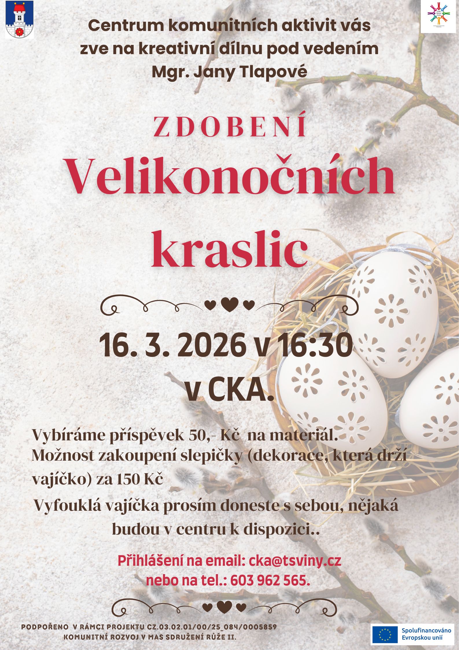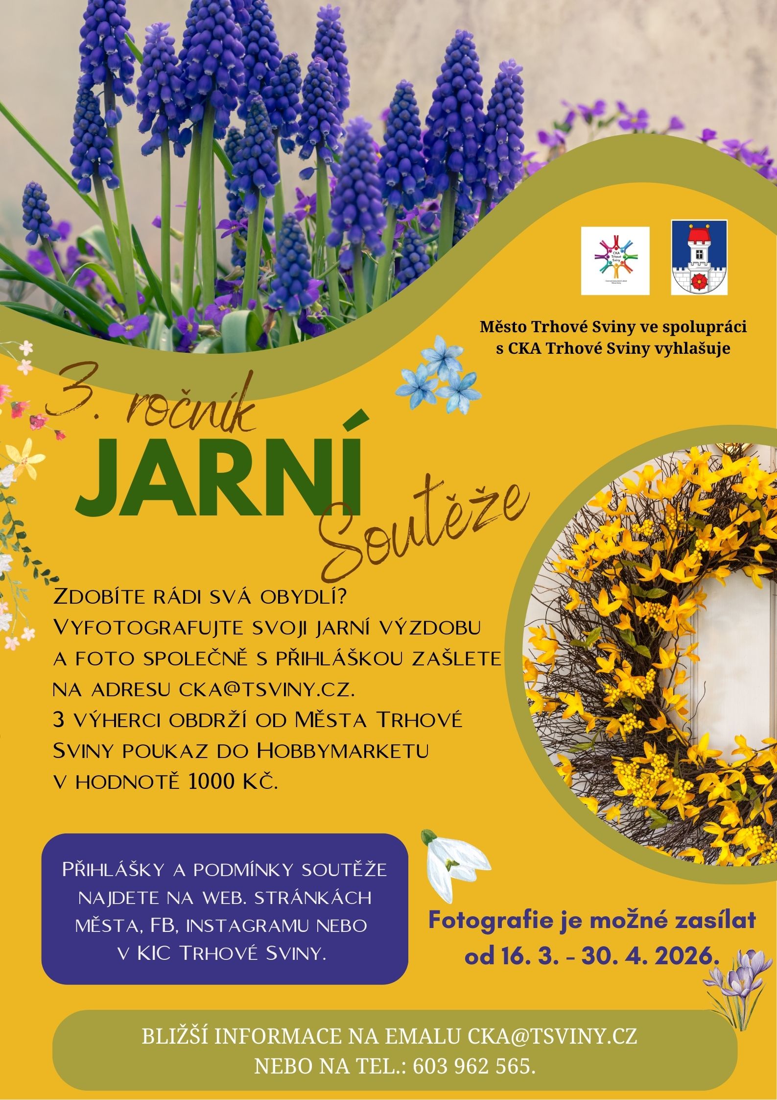 Město Trhové Sviny ve spolupráci s CKA vyhlašuje 3. ročník jarní soutěže o nejhezčí výzdobu! Fotografie zasílejte od 16. 3. do 30. 4. na e-mail CKA. Tři výherci získají poukaz v hodnotě 1000 Kč. Přihlášky a podmínky soutěže najdete na web. stránkách města, FB, instagramu nebo v KIC Trhové Sviny.